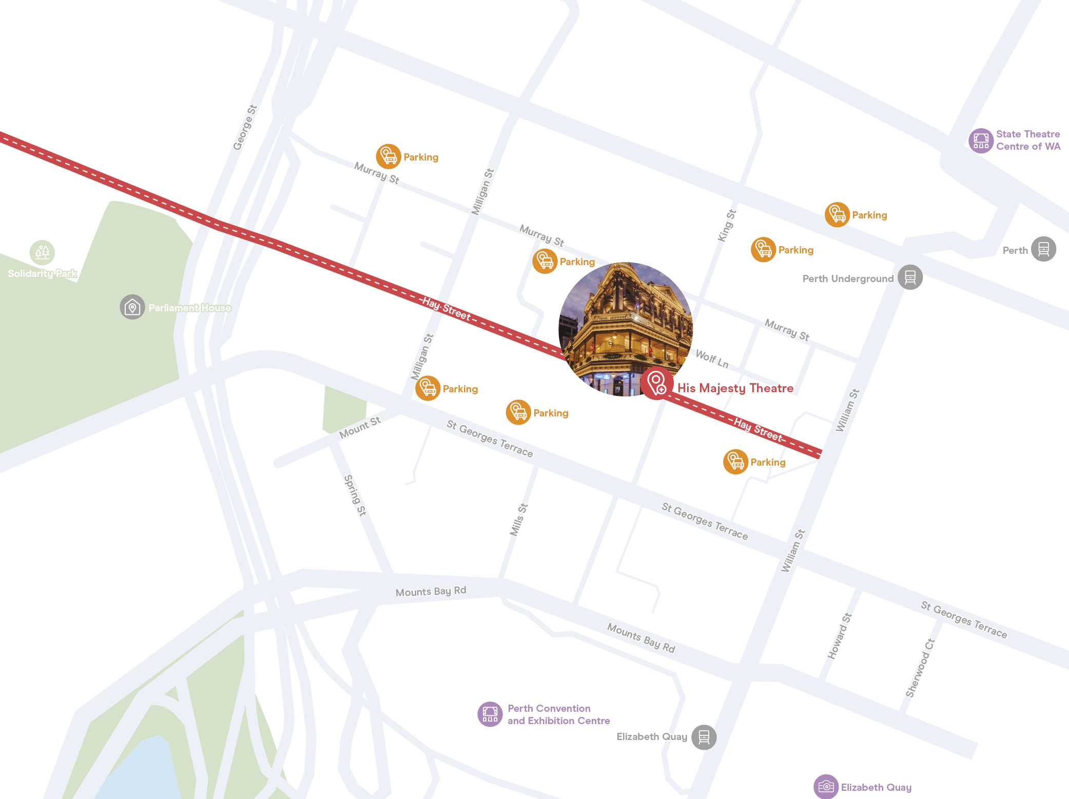 There are several nearby carparks, the closest being His Majesty’s Carpark via entry from Murray Street. Please see the City of Perth Parking and Wilson Parking for the most up to date information around pricing and availability. Parking may be limited in certain carparks based on other nearby events, so please plan ahead.